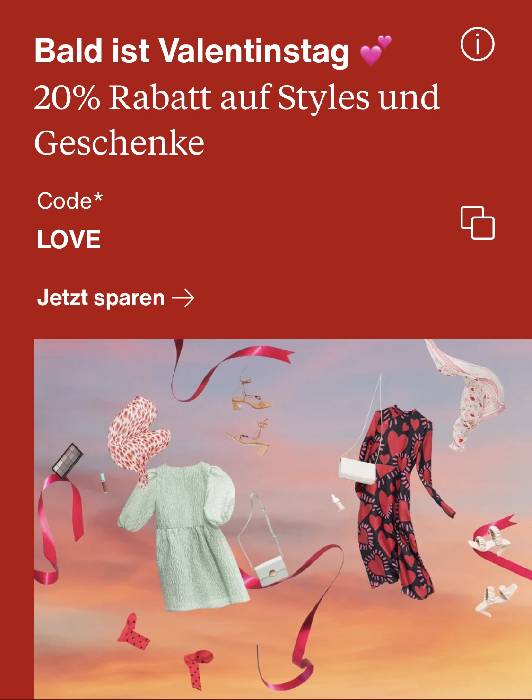 Bei Zalando bekommt man aktuell auf verschiedene Styles und Geschenke zum Valentinstag bis zu 20%. Dazu muss man den Code „LOVE“ im Warenkorb benutzen. Der Code gilt BIS zum 14.02.2022, 23:59 Uhr.