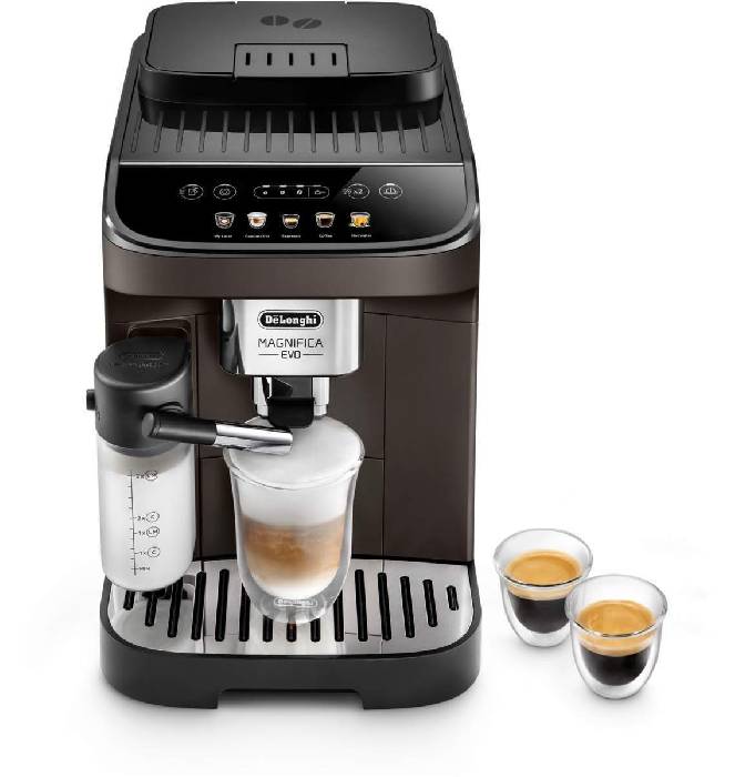 Aktuell gibt es bei EURONICS den Delonghi Magnifica Evo IFD ECAM 293.61.BW Kaffee-Vollautomat in braun im Angebot für nur 379,00 €. Im Preisvergleich zahlt man zur Zeit 434,34 €. EURONICS gibt zu dem Kaffee-Vollautomat noch folgende Infos an: 5 Direktwahltasten für Getränke auf Knopfdruck Ein intuitives Bedienfeld mit farbigen, berührungsempfindlichen Icons und LED Beleuchtung sorgen für einfache Bedienung und Getränkezubereitung auf Knopfdruck. Einfach Reinigung Die Abtropfschale und Milchkaraffe sind spülmaschinengeeignet und die neu konstruierte Tassenabstellfläche schützt vor Kratzern. Die Brühgruppe lässt sich zur einfachen Reinigung entnehmen. Milchschaum auf Knopfdruck Mit dem patentierten Latte Crema System bereiten Sie auf Knopfdruck cremigen, feinporigen Milchschaum zu. Die Reinigung erfolgt ebenfalls vollautomatisch. Magnifica Evo verkörpert die langjährige Erfahrung und das technische Know-How von De`Longhi mit dem Anspruch auf perfekten Kaffeegenuss. Immer frisch gemahlen und perfekt aufgebrüht. Entwickelt für Liebhaber von Espresso und Kaffeespezialitäten mit Milchschaum bietet dieses Modell perfekten Kaffeegenuss, einfachste Bedienung und ein modernes, ansprechendes Design. Mit einer Auswahl der beliebtesten Kaffeerezepte, einem farbigen Bedienfeld für die Zubereitung aller Getränke mit nur einem Fingertipp und der Möglichkeit die Einstellungen den individuellen Bedürfnissen entsprechend anzupassen (Aroma, Füllmenge, Temperatur) wird Kaffee zum Genuss. Mit dem automatischen Latte Crema Milchaufschäumsystem bereiten Sie auf Knopfdruck perfekten Milchschaum für Cappuccino und andere Kaffeespezialitäten. Mit der "MyLatte" Funktion entscheiden Sie individuell über die gewünschte Milchschaummenge. EAN: 8004399024731