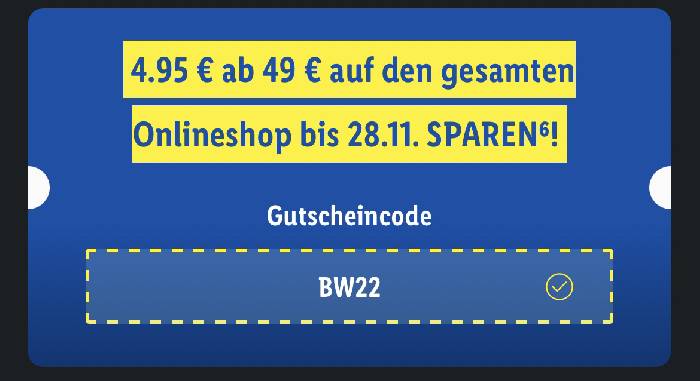 Lidl gibt folgende Informationen zu der Nutzung des Gutscheins an: Black Week Deals: Der 4.95 € Versandkosten-Gutschein gilt für eine Bestellung unter lidl.de vom 13.11. - 28.11.2022. Der Mindestbestellwert muss 49 € bezogen auf die im Warenkorb befindlichen Artikel übersteigen. Die Einlösung des Versandkosten-Gutscheins erfolgt durch Eingabe des Gutscheincodes im letzten Bestellschritt. Er gilt nicht für Lidl Fotos, Lidl Reisen, Lidl Connect und unsere Partner unter www.lidl.de/c/partnervorteile/s10007279. Ausgenommen sind zudem Bücher und Medien. Der Gutschein ist nicht auf den Versandkostenzuschlag anrechenbar. Keine Barauszahlung möglich und nicht mit anderen Gutscheinen/Sonderangeboten kombinierbar. Für bereits getätigte Einkäufe ist das Angebot nicht gültig. Die Angebote auf lidl.de richten sich ausschließlich an Endkunden mit einer Lieferanschrift in Deutschland. Onlineshop-Angebote: Lidl Digital International GmbH & Co. KG, Stiftsbergstr. 1, 74172 Neckarsulm.Bei einem Einkaufswert von 49,00 € gibt es die 4,95€ Versandkosten bei Lidl aktuell geschenkt. Dazu einfach den Code „BW22“ nutzen.