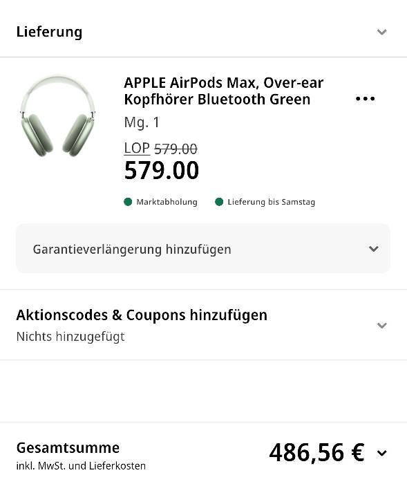 Bei Mediamarkt gibt es bis zum 12.02.2024 im Zuge der „MwSt Geschenkt“ Aktion die Apple Airpods Max (2707452) in Green für nur 486,56 €. Der reduzierte Preis wird erst im Warenkorb angezeigt. Preisvergleich liegt bei 548,00 €.