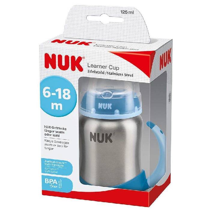 NUK First Choice Plus Learner Cup Edelstahl Trinklernflasche 125ml mit Griffen & Silikon Trinktülle, 6-18 Monate