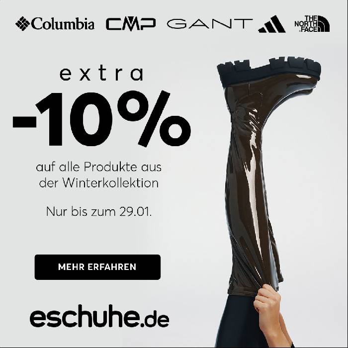 Bei eschuhe bekommt man zur Zeit extra -10% auf alle Produkte aus der Winterkollektion. Rabatt-Code: EXTRA10 Die Aktion läuft vom 26.01 bis zum 29.01.
