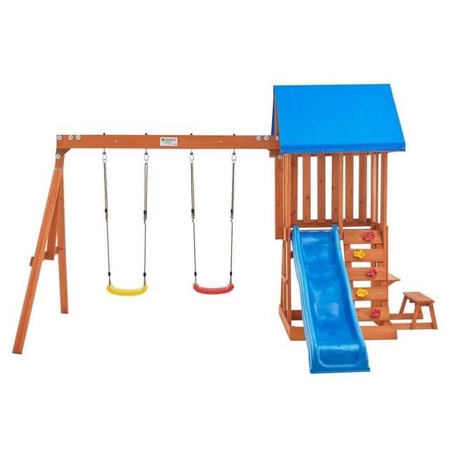 Juskys Spielturm Yannis, Wellenrutsche, 2 Schaukeln, Kletterwand, witterungsbeständig