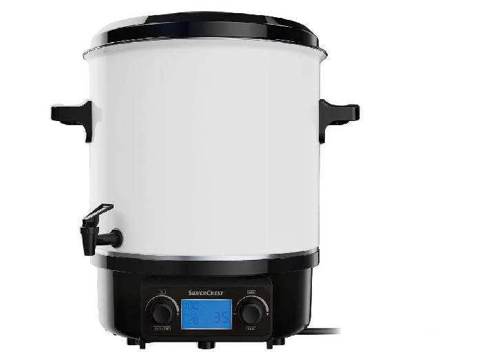 Bei Lidl bekommt man zur Zeit den SILVERCREST® Einkochautomat digital mit LCD SEAD 1800 A1 für nur 64,94 €. Im Preisvergleich zahlt man zur Zeit 74,94 €. Lidl gibt zu dem Einkochautomat digital mit LCD SEAD 1800 A1 noch folgende Infos an: Zum Einkochen und Konservieren von Marmelade, Obst und Gemüse Auch zum Erwärmen und Warmhalten von Getränken, Eintöpfen, Suppen und anderen Speisen Mit digitalem Display und elektronischer Steuerung Für bis zu 14 Einkochgläser in 2 Lagen – inkl. Einkochgitter Emailliertes Gehäuse und wärmeisolierte Griffe Integrierter Zapfhahn z.B. für Punsch Kessel mit großem Fassungsvermögen (ca. 27 l) Variable Temperatureinstellung von 30-100 °C Timerfunktion Überhitzungsschutz Signalton beim Erreichen der Zieltemperatur bzw. Ablauf der eingestellten Kochdauer Digitale Anzeige von aktueller und voreingestellter Temperatur sowie Restlaufzeit Kabelaufwicklung und Antirutschfüße Technische Daten: Leistungsaufnahme: 1800 W Fassungsvermögen: ca. 27 l Zeiteinstellung: 1-120 min Kabellänge: 110 cm Material: Stahl Maße: ca. Ø 36,6 x L 46 x H 41,8 Gewicht: ca. 5,8 kg EAN: 4055334053204