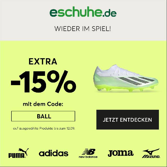 Mit dem Aktionscode „BALL“ gibt es bei eschuhe auf ausgewählte Schuhe im Fußball-Kontext 15% Rabatt. Die Aktion läuft bis zum 12.09.2023.