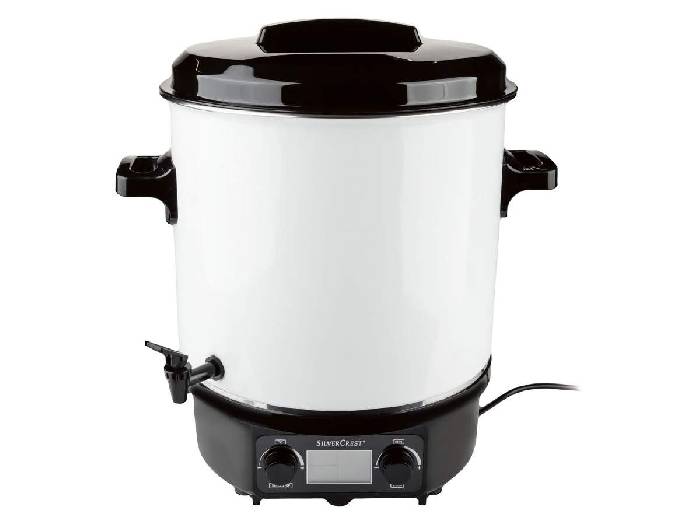 Zur Zeit bekommt man bei Lidl den Silvercrest Kitchen Tools Einkochautomat »SEAD 1800« mit Display und 1800 Watt für nur 64,94 €. Regulär zahlt man hier 84,94 €. Lidl gibt zu dem Einkochautomat noch folgende Infos an: - Zum Einkochen und Konservieren von Marmelade, Obst und Gemüse - Auch zum Erwärmen und Warmhalten von Getränken, Eintöpfen, Suppen und anderen Speisen - Mit digitalem Display und elektronischer Steuerung - Für bis zu 14 Einkochgläser in 2 Lagen – inkl. Einkochgitter - Emailliertes Gehäuse und wärmeisolierte Griffe - Integrierter Zapfhahn z.B. für Punsch - Kessel mit großem Fassungsvermögen (ca. 27 l) - Variable Temperatureinstellung von 30–100 °C - Timerfunktion - Überhitzungsschutz - Signalton beim Erreichen der Zieltemperatur bzw. Ablauf der eingestellten Kochdauer - Digitale Anzeige von aktueller und voreingestellter Temperatur sowie Restlaufzeit - Kabelaufwicklung und Antirutschfüße - Fassungsvermögen: ca. 27 l - Zeiteinstellung: 1–120 min Technische Daten: - Leistungsaufnahme: 1800 W - Kabellänge: 110 cm Material: Stahl, Kunststoff Maße: - Basis: ca. Ø, 33,2 x H 12,5 cm - Behälter mit Griffen: ca. Ø, 46 x H 29,3 cm Gewicht: ca. 5,8 kg EAN: 4054601025050