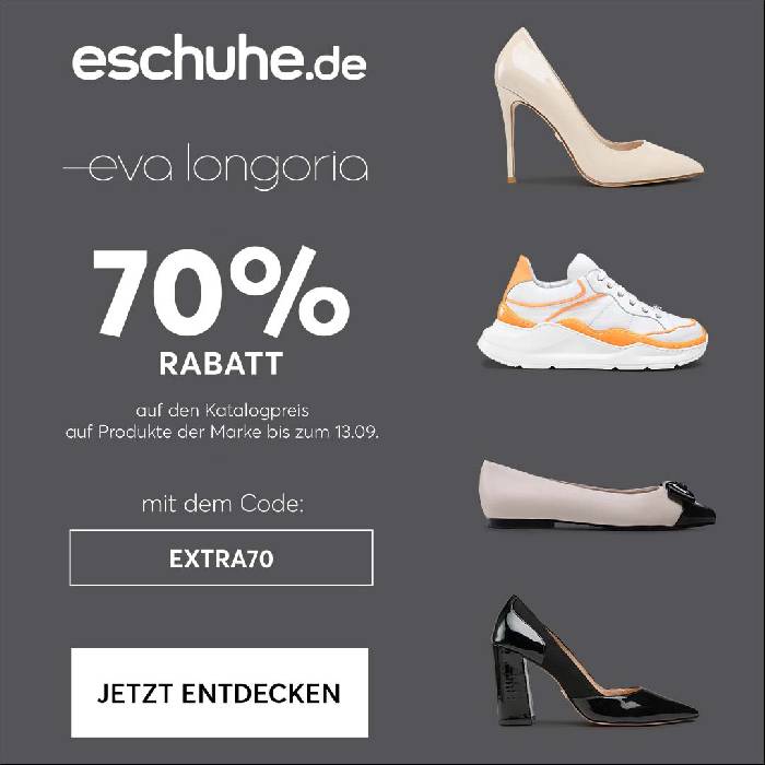 Mit dem Rabattcode „EXTRA70“ bekommt man bei eschuhe bis zum bis zum 13.09.2023 bis zu 70% Rabatt auf Produkte der Marke Eva Longoria.