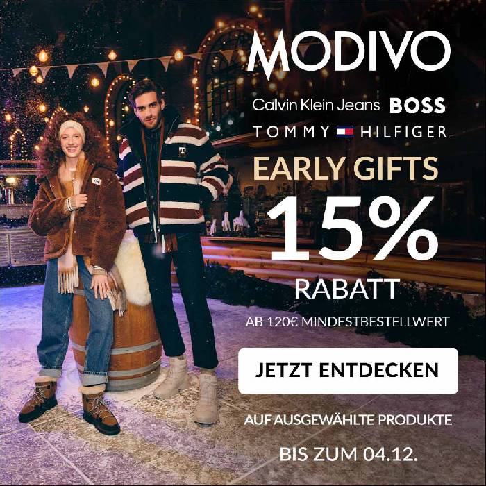 Mit dem Rabattcode „GIFT“ gibt es bei Modivo nur noch heute (04.12.2023) 15% Rabatt auf ausgewählte Artikel.