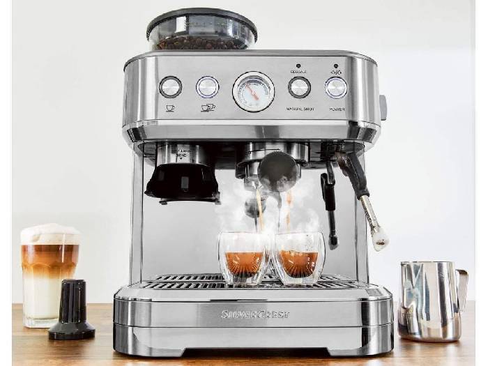 Zur Zeit bekommt man bei Lidl die SILVERCREST® Profi Siebträgermaschine »SSMP 1770 A« für nur 303,95 €. Regulär zahlt man hierfür 353,95 €. Lidl gibt zu der Profi Siebträgermaschine noch folgende Infos an: - SILVERCREST® Siebträgermaschine Profi »SSMP 1770 A« mit integriertem Mahlwerk Eigenschaften: - Für Kaffeegetränke in Barista-Qualität - Hochwertiges Design in Edelstahl - Zubereitung von 1 oder 2 Tassen mit automatischem Stopp - Leistungsstarke 15-bar-Pumpe für perfekte Crema und ideale Aromaentfaltung - Italienische Qualitätspumpe - Kegelmahlwerk mit 15 Mahlgradeinstellungen - Bohnenbehälter für ca. 250 g Bohnen Milchaufschäumdüse; auch zur Heißwasserbereitung geeignet - Abnehmbarer Wassertank (2;3 l) - Thermoblock-Heizsystem: Für schnelles Aufheizen des Wassers - Tassen-Warmhaltefunktion - Mit Entkalkungsfunktion Inkl. Zitronensäure zum Entkalken - Automatische Geräteabschaltung - Espressotemperatur einstellbar - Siebträger - kleines und großes Sieb - Tamper - Milchkännchen - Reinigungsbürste und Entkalker inklusive Technische Daten: Leistungsaufnahme: max. 1770 W Lieferumfang: Siebträgermaschine Siebträger, Kleines und großes Sieb, Tamper, Milchkännchen, Reinigungsbürste und Entkalker Maße Gesamt: ca. B 34 x H 41 x T 32 cm Kabellänge: ca. 100 cm EAN: 4056233762990