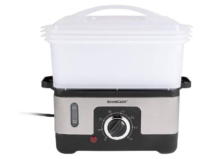 Zur Zeit bekommt man bei Lidl den SILVERCREST® Dampfgarer »SDG 950 C3« für nur 30,94 €. Regulär zahlt man hier 35,94 €. Lidl gibt zu dem Dampfgarer »SDG 950 C3« noch folgende Infos an: - Zur schonenden und gesundheitsbewussten Zubereitung von Speisen - Wertvolle Mineralstoffe und Vitamine bleiben weitestgehend erhalten - Garen ohne zusätzliches Öl oder Fett - 3 BPA-freie Dampfgaraufsätze* (je ca. 3 l) zur gleichzeitigen Zubereitung von Gemüse, Fisch oder Fleisch - Auch als Eierkocher verwendbar - 75-Minuten-Timer - Signalton bei Garzeitende - Wassertank mit Wasserstandsanzeige für bis zu 1 Stunde Dauerbetrieb (ca. 1,2 L) - Wasser nachfüllen auch während des Garvorgangs möglich - Automatische Abschaltung bei aufgebrauchtem Wasser - Aufsätze platzsparend ineinander stapelbar - Abnehmbare Teile sind spülmaschinengeeignet - Enthaltenes Zubehör: Reisschale (1 l) und Kondensat-Auffangschale Technische Daten: - Kabellänge: ca. 116 cm - Leistungsaufnahme: 950 W Material: Kunststoff, Edelstahl Maße: ca. 391 x 287 x 235 mm Gewicht: ca. 1883 g EAN: 4055334444767