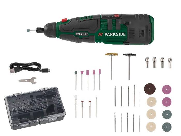 Bei Lidl bekommt man zur Zeit den PARKSIDE® Akku-Feinbohrschleifer »PFBS 12 C7«, 12 V für nur 30,94 €. Im Preisvergleich zahlt man hierfür 40,94 €. Lidl gibt zu dem Akku-Feinbohrschleifer noch folgende Infos an: - Zum Bohren, Fräsen, Schleifen, Polieren, Reinigen, Trennen und Gravieren - Einstellbare Drehzahl - Leistungsstarker 12-V-Lithium-Ionen-Akku (1,3 Ah) - Kompakte Bauform mit rutschhemmender Softgrip-Ausstattung - Inkl. Spindelarretierung - In praktischer Aufbewahrungsbox - Leerlaufdrehzahl: 5.000 - 25.000 1/min - Drehzahl: - Stufe 1: 4.000-5.500 - Stufe 2: 7.000-8.500 - Stufe 3: 10.000-11.500 - Stufe 4: 13.000-14.500 - Stufe 5: 16.000-17.500 - Stufe 6: 19.000-20.500 - Max. 23.500-25.000 - Max. Scheiben-Ø,: 25 mm - Leistung: - 12 V - Leerlaufdrehzahl: - 5.000 - 25.000 1/min Akkuspannung: - 12 V Schleifteller-Ø,: - ca. 25 mm - Schleiftellergeschwindigkeit: - max. 23.500-25.000 1/min Zubehör: - 1,5 m USB-C-Kabel, Querschnitt 22 AWG - 6 x HSS Bohrer (HSS) - 2 x Spanndorne (Stahl) - 3 x Polierscheiben (Filz aus Wolle und Polyester) - 4 x Schleifscheiben (Aluminium-Oxid) - 1 x Metallbürste (Stahldraht) - 16 x Trennscheiben (Aluminium-Oxid) - 5 x Spannzangen (Kupfer verchromt) - 2 x Kunststoffbürsten (Kunststoff) - 3 x Fräsbits (HSS) - 2 x Gravierbits (Schmirgel) - 5 x Schleifbits (Aluminium-Oxid) - 1 x Kombi-Schlüsse - Aufbewahrungskoffer: ja Maße: - ca. 205 x 55 x 49 mm - Kabellänge: - ca. 1,5 m Gewicht: - Maschine (inkl. Akku): 380 g - Zubehör: 84 g - Kunststoffbox: 335 g EAN: 4334036007426