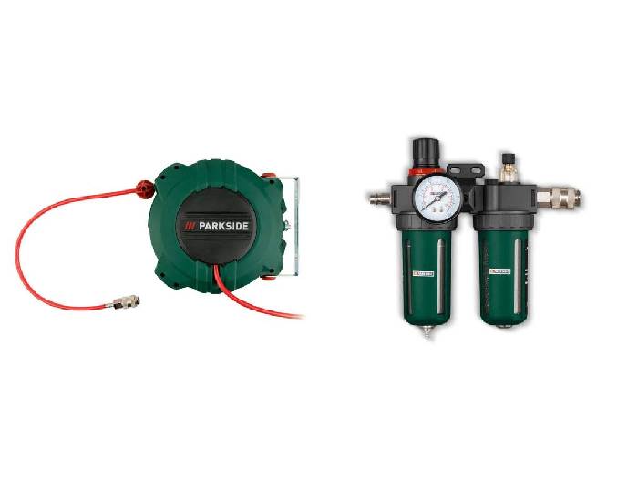 Bei Lidl bekommt man zur Zeit die PARKSIDE® Druckluft-Schlauchtrommel für nur 25,94 €. Im Preisvergleich zahlt man zur Zeit 32,94 €. Lidl gibt zu der Druckluft-Schlauchtrommel mit Rückzug noch folgende Infos an: - Schlauchtrommel mit Rückzug »PDST 10 B3« - Komfortable Schlauchtrommel mit automatischem Einzug - 180° schwenkbares Trommelgehäuse mit robuster Wandhalterung aus Metall - Schlauchtrommel werkzeuglos aus Wandhalterung entnehmbar - Langlebige Schlauchausführung in knick-unempfindlicher Qualität - 10 m Druckluft-Schlauch inkl. Schnell-Anschlussstück - 3 m Kompressoranschluss-Schlauch mit - Fixierung des ausgezogenen Schlauchs durch feinteilige Arretierung - Selbsttätige Aufwicklung durch kurzes Ziehen am Schlauch - Zur Wandmontage oder zum Aufhängen mit integriertem Karabinerhaken - Inkl. Wandmontagematerial - Druckluft-Wartungseinheit »PDW 8 B2« - 3 in 1: Druckregulierung, Druckluftaufbereitung und Schmierung - Druckminderer mit stufenlos einstellbarem Betriebsdruck und Kontroll-Manometer - Wasserabscheider mit auswechselbarem Filter und integriertem Ablassventil - Nebelöler mit einstellbarer Ölmengenzufuhr und Öffnung zum Nachfüllen - Behälter werkzeuglos per Schraubverschluss abnehmbar - Mit Vorrichtung zur Wandmontage - Inkl. vormontiertem Anschlussadapter Technische Daten: - Länge Druckluft-Schlauch: 10 m - Länge Kompressoranschluss-Schlauch: 3 m - Max. Arbeitsdruck: 10 bar - Regelbarer Betriebsdruck: 0,5–8 bar - Luftaufbereitung: Wechselfilter + Wasserabscheider - Schmierung: Regelbarer Nebelöler - Max. Arbeitsdruck: 8 bar Material: Stahl, Kunststoff - Maße - Schlauchtrommel mit Rückzug: ca. 252 x 234 x 101 mm - Wartungseinheit: ca. 220 x 220 x 100 mm Gewicht: - Schlauchtrommel mit Rückzug: ca. 1700 g - Wartungseinheit: ca. 750 g EAN: 4055334441926