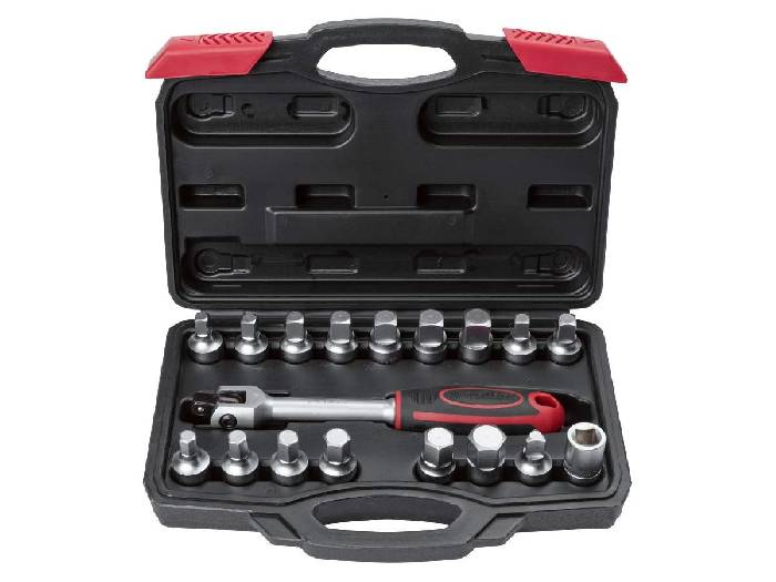 Das 18 teilige PARKSIDE® Ölablassschraubenset ist bei Lidl für 20,94 € inklusive Versandkosten von 4,95 € erhältlich. Im Preisvergleich bezahlt man aktuell 29,94 €. Das Set beinhaltet: 1x 3/8" 2K-Handgriff, 9x Aufsatz mit Außenvierkant (5/16", 3/8", 7, 8, 10, 11, 12, 13, 14 mm), 1x Aufsatz mit Innenvierkant (10 mm), 1x Aufsatz mit Außendreikant (10 mm) und 6x Aufsatz mit Außensechskant (8, 9, 10, 12, 14, 17 mm). Es ist zum einfachen Ölwechsel fast aller Kfz-Modelle geeignet und übersichtlich sortiert im praktischen Aufbewahrungskoffer. Maße des Handgriffs betragen ca. 20 cm, die Box ca. 23,5 x 16,5 x 5,2 cm und das Gewicht ca. 1430 g. EAN: 4055333048638