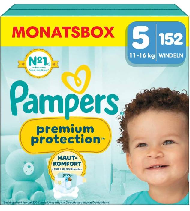 Pampers Premium Protection Größe 5, 152 Windeln, 11kg-16kg, Doppelter Schutz für die Haut und vor Auslaufen